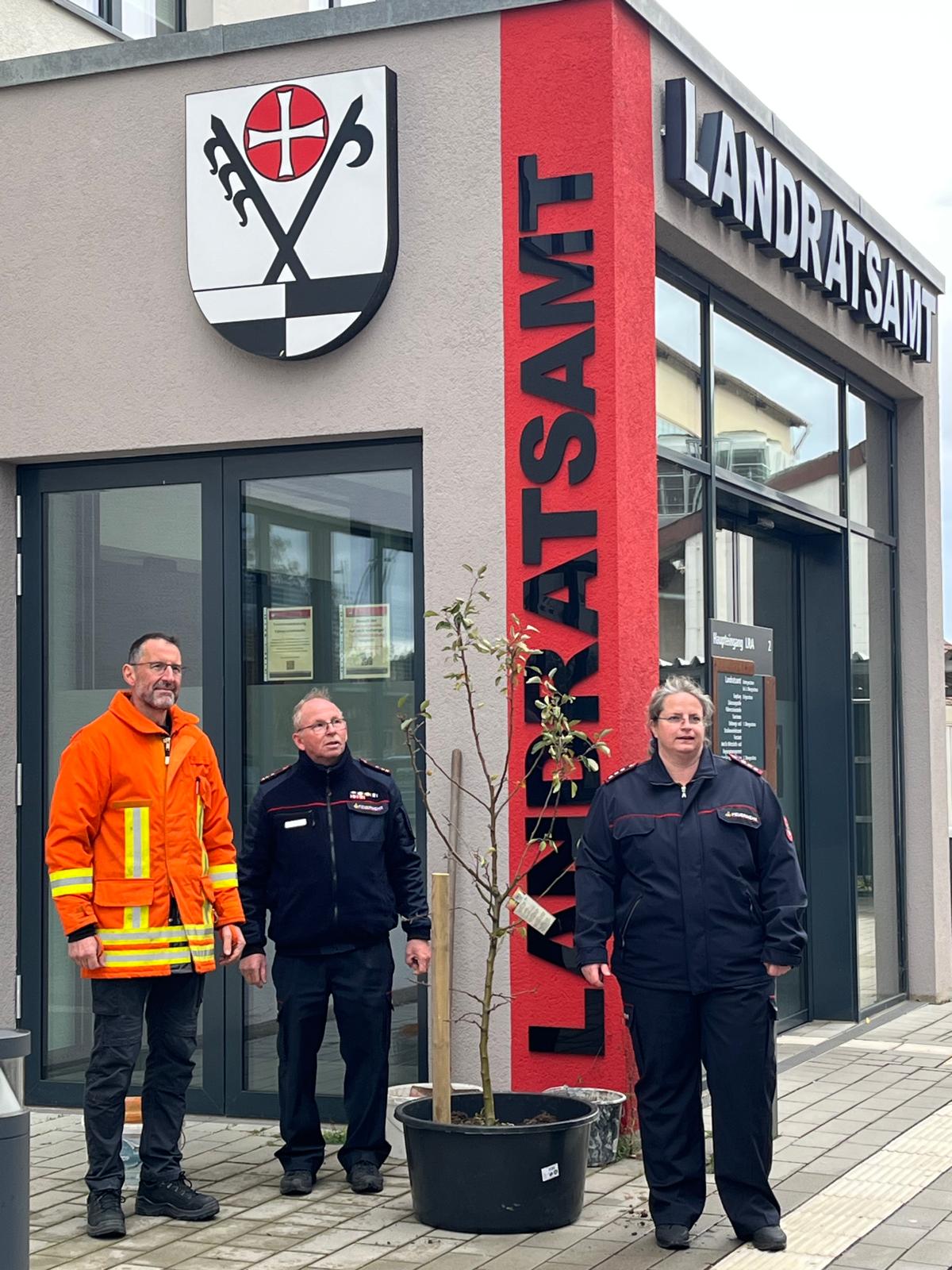 Nach der Nominierung des Kreisfeuerwehrverbands durch die Feuerwehr Obersontheim bei der kursierenden Baumpflanz-Challenge haben Alexandra Zieffle (stellvertretende Vorsitzende) und die beiden Ausschussmitglieder Eberhard Krebs und Uwe Stegmaier einen Apfelbaum gepflanzt. Bis ein endgültiger Platz für den Baum gefunden wurde, ist er erstmal im Topf gelandet. Trotzdem: Challenge erfüllt.